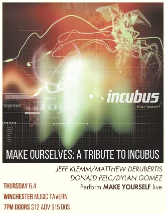 Make Yourself by Incubus changed rock music when it dropped in 1999. With its bold declaration of personal freedom from societal norms set to a unique sound of dynamic guitars, soaring vocals and intricate grooves, this record stands as one of the greatest of its era. Make Ourselves is Jeff Klemm (vocals), Matthew DeRubertis (bass), Donald Pelc (guitar), and Dylan Gomez (drums & samples). They will be performing the ENTIRE album from start to finish (and some other Incubus classics) at the Winchester on June 4th.7pm door8pm show $12 ADV