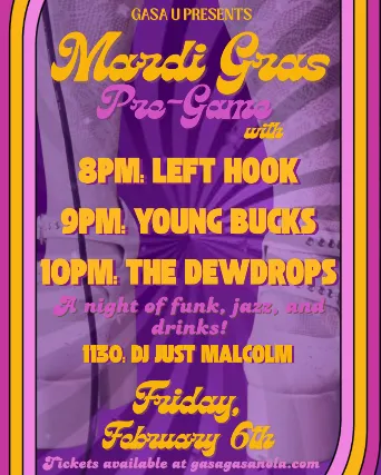 Gasa U Presents Mardi Gras Pregame with jazzy funk vibes for everyone to get hip to!Pull up at 8pm to get parade-ready!