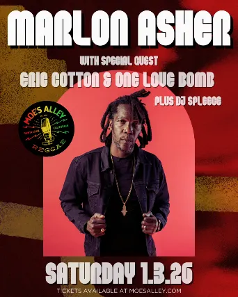 Moes Alley presents the return of the Ganja Farmer from Trinidad & Tobago, Marlon Asher! Saturday, January 3, 2026Doors: 8pm / Show: 9pm$25 in advance / $30 day of the show21+*All sales all final*Avoid scammers! Only purchase tickets from moesalley.com or ticketweb.com--------MARLON ASHERMarlon grew up in Enterprise, Trinidad s 2019 amphitheater tour. The highlight of this tour was a sold out show at Red Rocks in Morrison, Colorado. He has toured the US, Hawaii, Costa Rica, Canada, Africa and Europe. Marlon paved the way for other Trinidad artists such as Jah Melody, Khari Kill, I-Sasha, Jah Bami and many more.