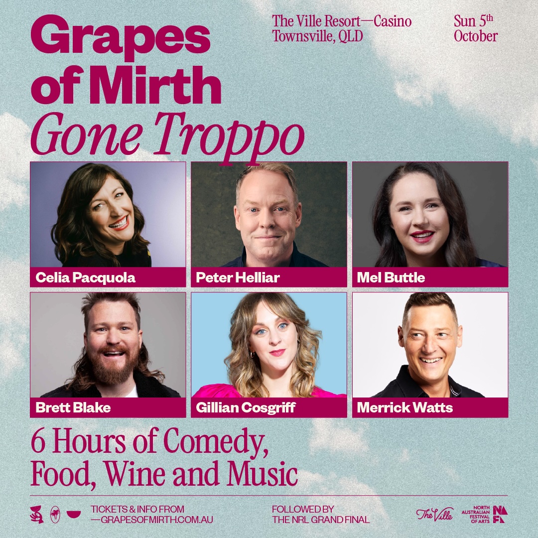 Grapes of Mirth is hosted by our very own Head Clown, Merrick Watts. Joining him in NQ are superstars of the small screen and stage, Celia Pacquola and Peter Helliar. One of Australia's very best comedians, Queenslander Mel Buttle, and two comedians that all other comedians love to watch, Brett Blake and Gillian Cosgriff.