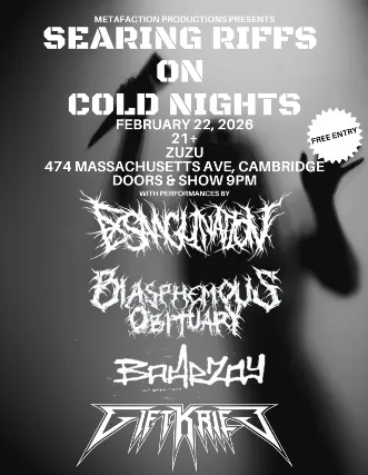 21+ w/Valid I.D. NO I.D.=NO ADMISSIONThe Middle East & ZuZu presents: MetaFaction Presents: Exsanguination, Blasphemous Obituary, Boarzoy, Giftkrieg - 21+ 9:00pm doors NO VAPING OR SMOKING IN THE BUILDING​*** DINE and SKIP the Line ***