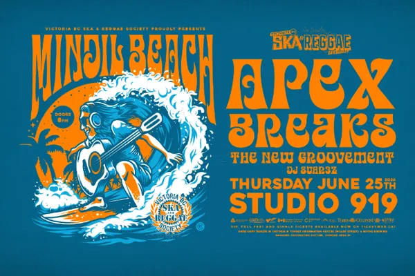 Three of our communitys grooviest groups, and some of our best friends, are coming together for a Thursday night party celebrating the diverse array of influences and talents that make our city so colourful. After a triumphant return at a jam-packed Lucky Bar this past December, MINDIL BEACH makes an even more triumphant return to the Victoria Ska the group founded The Jellyfish Project, promoting environmental stewardship throughout BC schools and their engaging mix of funk, folk, reggae and hip-hop have kept them in them in the hearts of the Ska & Reggae Massive during their extended hiatus, as evidenced by the sell-out crowd that filled Lucky at their return show. Now fronted by Roderick Campbell and armed with an array of newly completed songs, Mindil Beach is back and ready to reclaim their place.Also on the bill is one of the most loveable group of musical merrymakers to come out of the island, APEX BREAKS. With regular highlight appearances on our festival stages, shows up and down the island to sweaty, heavy crowds and a string of hard-funking singles, the psychedelic jungle funk monster has become one of the most reliable party-rocking outfits the city has to offer. Kicking off this celebration of Vic Citys deep grooves is our longtime allies THE NEW GROOVEMENT. For nearly 15 years, The New Groovement have been stalwarts of the west coast music scene, amassing a devoted legion of fans across the province. When The New Groovement is on stage laying down their frankly hard-hitting funked out hip-hop, youll be hard pressed to find anyone standing still. The group demands dancing and its a demand that is hard to ignore. CWith the mighty DJ SUAR3Z, fresh off her appearance at this years Garden City Grooves, keeping the party hot between sets, this is a jam-packed Thursday night party that will please groove-seekers of all shades happy and moving.