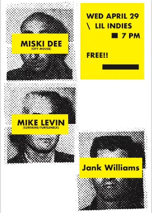 Miski Dee, Mike Levin, and Jank WilliamsLive at Lil Indies on April 29th, 2026No Cover7PM Doors