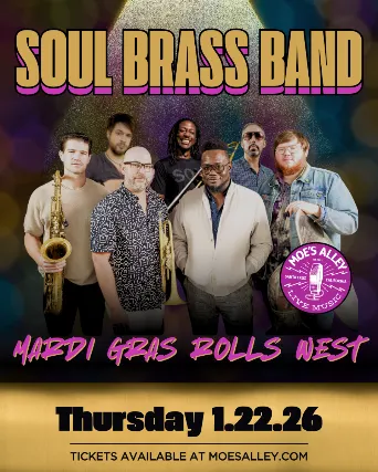 Moes Alley presents New Orleans own Soul Brass Band! Thursday, January 22, 2026Doors: 7pm / Show: 8pm$20 in advance / $25 day of the show21+*All sales are final*Avoid scammers! Only purchase tickets from moesalley.com or ticketweb.com======SOUL BRASS BANDSoul Brass Band is the brainchild of drummer, emcee, and New Orleans cultural force Derrick Smoker Freeman, blending second line tradition with hip hop grit, deep funk, and streetwise soul. Their performances flip every stage into a block partyblurring the line between concert and carnival.Soul Brass Band delivers a fresh interpretation of the brass band canoninfusing deep street rhythms with jazz stylings, soul sounds, and Freemans magnetic stage presence.Whether leading a second line parade, igniting a hotel rooftop, or headlining a cultural showcase, Soul Brass Band brings the heartbeat of New Orleans to every event.