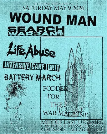 All Ages -- Valid I.D. Required To Drink The Middle East & Mostly Fast Shit Presents : Wound Man, Search Warrant, Life Abuse, Battery March - All Ages, $15, 8:00 PM DoorsNO VAPING OR SMOKING IN THE BUILDING*** DINE and SKIP the Line ***