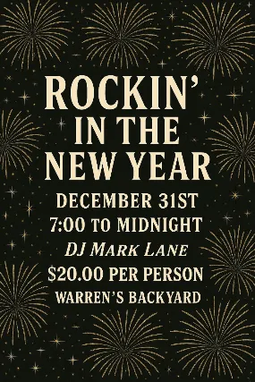 Warrens Backyard will be Rockin in the New Year on December 31st from 7:00pm to Midnight!$20 a ticket this includes DJ Mark Lane, a champagne toast, snacks, black-eyed peas and Fireworks (weather permitting)Buy tickets ASAP!No outside food, drinks, coolers or cups!Porter Cafe food truck will be available for all your dinner plans!