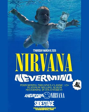 Thursday, March 19, 2026Nirvana Tribute Show!Performing Nirvanas classic 13x platinum selling album Nevermind in its entirety. Performed by ANEURYSM: TRIBUTE TO NIRVANA. All ages!Doors 7PMMusic 8PM$20 Advance | ALL AGES