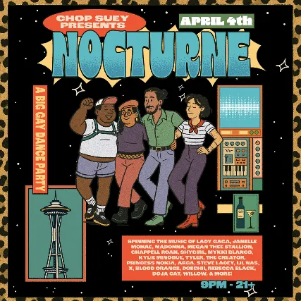 NOCTURNE: A Big Gay Dance PartySaturday, April 4th at Chop Suey Spinning the music of Lady Gaga, Janelle Monae, Madonna, Megan Thee Stallion, Chappell Roan, Shygirl, Mykki Blanco, Kylie Minogue, Tyler, The Creator, Princess Nokia, Arca, Steve Lacey, Lil Nas X, Blood Orange, Doechii, Rebecca Black, Doja Cat, Willow, & more! 9pm | 21+