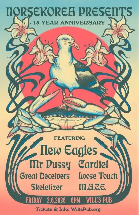Norsekorea Presents: 15 YearsFriday, February 6th 2026 FeaturingNew eagles Mr PussyCardielGreat Deceivers Loose Touch SkeletizerM.A.C.E. DOORS 6PM21 and upTICKETS:$13 until November 15$15 November 15 - December 15$17 December 16 - February 5$20 day-of show