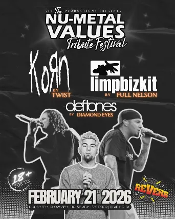 Nu-Metal Values Tribute Festival531 Productions Presents: Nu-Metal Values Tribute FestivalFeat. Full Nelson [Limp Bizkit], Twist [Korn] & Diamond Eyes [Deftones]21+7:00 PM Doors | 8:00 PM Show$15 ADV | $20 DOS NU METAL VALUES RETURNS TO REVERB!Where nostalgia hits harder than a breakdown. Theyre coming back to Readingand theyre bringing the soundtrack of your teenage angst with us. Dust off the JNCOs, tighten up the chain wallet, and get ready to scream every word like its 1999 all over again. Three heavy-hitting tributes. One stacked night. All the energy you remember. Limp Bizkit performed by Full Nelson Korn performed by Twist Deftones performed by Diamond Eyes Whether you were blasting these bands in your bedroom, burning mix CDs, or catching them on late-night MTV, this is your chance to relive that raw, electric era with the Nu Metal Family.