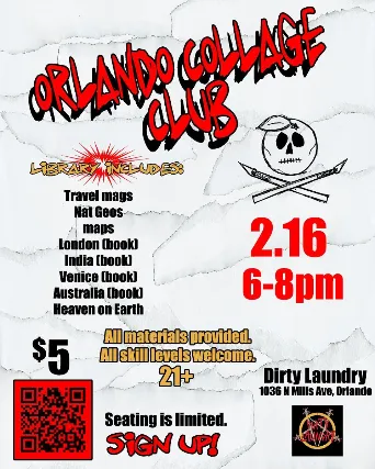 Orlando Collage ClubDate: February 16Time: 6:00 PM 8:00 PMLocation: Dirty Laundry1036 N Mills Ave, Orlando, FL***Admission: $5 // use QR CODE on flyer or click this link.***Age Requirement: 21+Join Orlando Collage Club for an evening of cutting, pasting, and creating. All materials are provided, and all skill levels are welcome. Whether youre brand new to collage or have been making art for years, this is a laid-back space to get creative.Our collage library includes:Travel magazinesNational GeographicsMapsLondon (book)India (book)Venice (book)Australia (book)Heaven on EarthSeating is limited, so be sure to sign up in advance!