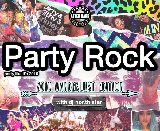 After Dark PresentsPARTY ROCK: 2016 WANDERLUST EDITIONParty Rock really is in the house tonight - come experience the ultimate 2010s throwback hosted by DJ Nor.th Star! We will be reliving 2016 spinning the greatest hits from Zedd, The Chainsmokers, Hailee Steinfeld, Kiesza, LMFAO, Galantis, Rihanna, M, Jack , Fetty Wap, Major Lazer, Justin Bieber, Pitbull, Flo Rida, The Weeknd, Zara Larsson, Beyonce, Selena Gomez, & more.Age Restriction: 18+ Admitted with ID