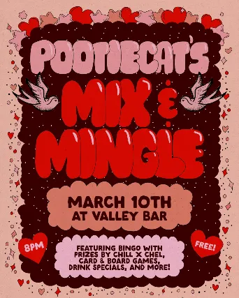 MIX AND MINGLE hosted by DJ POOTIECATA casual singles night with games, drinks, and of course DJ Pootiecat providing the sounds. 8 PM - late21+FREE IN THE ROSE ROOM