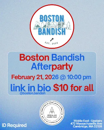18+ w/Valid I.D. NO I.D.=NO ADMISSION The Middle East presents: Boston Bandish Afterparty - 18+, 10:00 PM Doors NO VAPING OR SMOKING IN THE BUILDING*** DINE and SKIP the Line ***