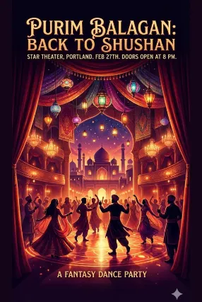 A Night of Music, Magic and MayhemA 1001 Nights inspired Purim Carnival Two DJs shaking the night Live band bringing the heat A dancer gliding like a dream Costumes inspired by old tales Shushan is calling so throw on your best,Silks, sparkles or chaos, whatever feels blessed.Music will roar and the dance floor will sway,Balagan is the story were telling this day.Step into the story.Dance into the chaos.Celebrate Purim the Shushan way.