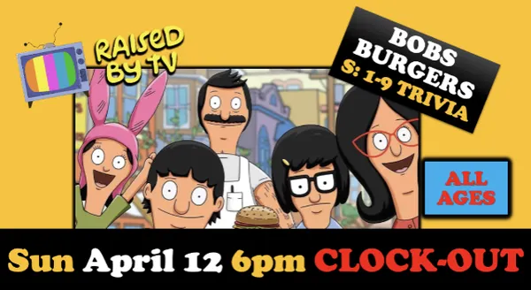 RAISED By TV brings you:BOBS BURGERS Trivia Night!50 BRAND NEW questions about your favorite Burger making family- covering seasons 1-9 Sun April 12th$7 ONLINE ADVANCE: {plus ticketing fees}$9 Day of & AT THE DOOR {plus ticketing fees}Doors open at 5:00. Trivia starts at 6:00!all ages til 8pm!Tables are first come first serve. **PRIZES**The RAISED BY TV gang has put together some killer prize packages. Teams of 1-5 are welcome. Prizes for 1st, 2nd, t have to be good at trivia just come on down to relive some Belcher family shenanigans with us. **FOOD & DRINKS**The Clock-Out has bar and full Stevies famous Pizza food service; one of the things that makes it our favorite place.The show is available on Hulu and Disney +We hope you can join RbyTV for a safe night of fun and brains.Brandon Ryan