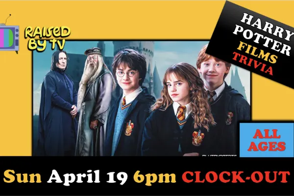 RAISED By TV brings you:Harry Potter Films Trivia Night!50 BRAND NEW questions about your favorite Hogwarts wizards. Sun April 19th 6pm$7 ONLINE ADVANCE: {plus ticketing fees}$9 AT THE DOOR {plus ticketing fees}Doors open at 5:00. Trivia starts at 6:00!Tables are first come first serve.Clock-Out is a 21 and over bar after 8pm **PRIZES**The RAISED BY TV gang has put together some killer prize packages. Teams of 1-5 are welcome. Prizes for 1st, 2nd, t have to be good at trivia just come on down to relive some Hogwarts shenanigans with us. **FOOD & DRINKS**The Clock-Out has bar and Stevies Famous Pizza food service; one of the things that makes it our favorite place.The show is available on HBO MAXWe hope you can join RbyTV for a safe night of fun and brains.Brandon Ryan