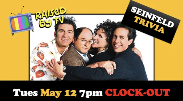 RAISED By TV brings you:SEINFELD Trivia Night!50 BRAND NEW questions about your favorite NY misfits- covering all 9 Seasons Tues May 12th$7 ONLINE ADVANCE: {plus ticketing fees}$9 Day of and AT THE DOOR {plus ticketing fees}Doors open at 5:30. Trivia starts at 7pmTables are first come first serve. THE CLOCK-OUT LOUNGEIs a 21 and over venue after 8pm **PRIZES**The RAISED BY TV gang have put together some killer prize packages. Teams of 1-5 are welcome. Prizes for 1st, 2nd, t have to be good at trivia just come on down to relive some Jerry apt shenanigans with us. **FOOD & DRINKS**The Clock-Out has bar and full Stevies Famous Pizza food service; one of the things that makes it our favorite place.The show is available on NetflixWe hope you can join RbyTV for a safe night of fun and brains.Brandon Ryan