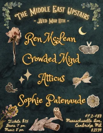 18+ w/Valid I.D. NO I.D.=NO ADMISSION The Middle East presents: Ren McLean, Atticus, Crowded Mind, & Sophia Patenaude - 18+, $15, 7:00 PM Doors NO VAPING OR SMOKING IN THE BUILDING*** DINE and SKIP the Line ***