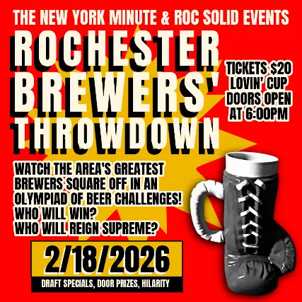 Price displayed includes the admission + service fees. NOTE - Tickets are taken off sale on the day of the event, but admission may still be purchased at the door. Watch the areas greatest brewers square off in an Olympiad of beer challenges. Who will win this part Quiz Bowl, part Double Dare, part Top Chef throwdown? Who will reign supreme? Your $20 ticket gets you in the door, and your first beer in your hand. Doors open at 6:00pm!presented by The New York Minute & ROC Solid EventsDoors @ 6pm | $20 general admission