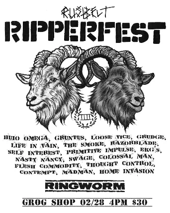 Rustbelt Ripperfest IVDay ThreeGrog Shop and B SideAll Ages$30Ripper Flea 12pm - 3:30pm - FREEBands starting at 4pmRingwormHome InvasionMadmanContemptThought ControlFlesh CommodityColossal ManSwageNasty NancyEKGsPrimitive ImpulseSelf InterestRazorbladeThe SmokeLife In VainGrudgeLoose ViceGruntusBuio Omega