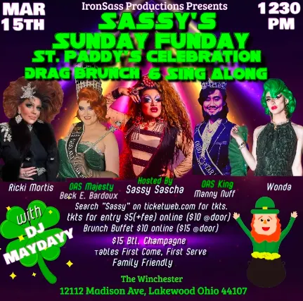 Sassys Sunday Funday Drag Brunch!Sunday, March 25th, 2026St. Paddys Celebration!12:30 show time$5 Show only General Admission ticket$15 Brunch buffet + show ticket * Brunch buffet will be $15 day of$15 bottles of champagne W/ Juice