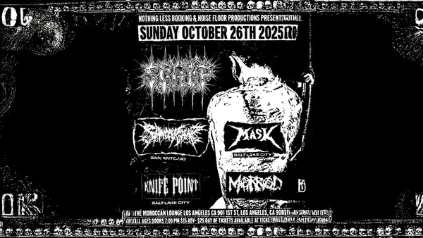 The Moroccan Lounge + NOTHING LESS BOOKING & NOISE FLOOR PRODUCTIONS PRESENTS: SCALP, SANITY SLIP, MASK, KNIFE POINT & MARRED [October 26, 2025 / Doors 8:00pm / $15 adv / $25 dos / All Ages] Originally scheduled for Oct 26 2025, 7 pm. Previously purchased tickets will be honored for the new time.