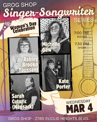 Wednesday, March 4Singer Songwriter Series Featuring: Ashley Brooke Toussant / Kate Porter / Sarah Cuturic (Napsack) / Michelle Gaw at Grog ShopDoors 7 PM l Show 7:30 PMALL AGES$10 advance / $12 day of show+ $3 at the door if under 21