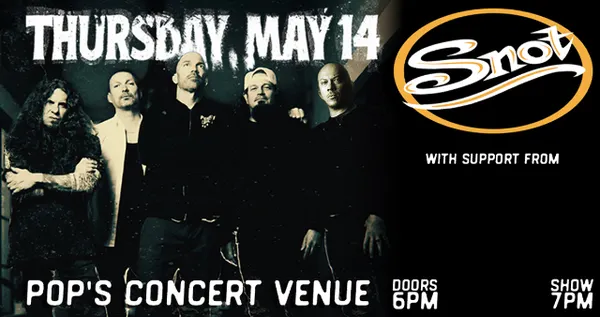 SNOT Live at Pops Nightclub & Concert VenueDate: Thursday, May 14th, 2026Venue: Pops Nightclub Sauget, ILDoors: 6:00 PMShow: 7:00 PM Get ready for a night of raw energy as Snot takes over the stage at Pops. Expect high-intensity performances and a full-on throwdown in true Sauget style with support from Abrade and StoKo.TicketsGA - $30Reserved Table Seat - $45Reserved Balcony Seat - $65Tickets On Sale Friday Nov 28th at 10AM