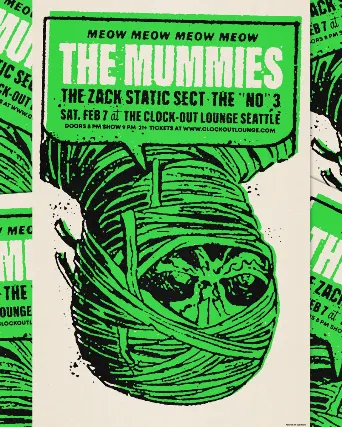 Clock-Out Lounge Presents: The MummiesThe Zack Static SectNo 3 Saturday, Feb 7th8 pm doors/9 pm show 21+ $25adv/$30 dos https://punkvalleyrecords.bandcamp.com/album/live-black-cat-11-2-24A punk/garage/surf four piece wrapped in horror embalmed bandaging taking garage rock to such depths of crude lo-fi they labelled themselves budget rock, matched with a feral onstage frenzy courtesy of front-mummy Trent Ruanenot unknown to quite literally wield his beat-up Doric organ above his head during their ephemeral underground shows.https://thezackstaticsect.bandcamp.com/album/rock-n-roll-records