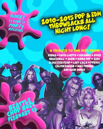 Take it back to a simpler time, where pop and dance music went hand in hand at every party. The only party where you can get down to these iconic club bangers and fist bump all night long like its still 2012!đź’“ Good vibes only! đź’“Featuring the music of...KE$HA David Guetta Rihanna Avicii Nicki Minaj Akon Icona Pop Black Eyed Peas Lady Gaga Pitbull Calvin Harris ZEDD Swedish House Mafia Katy Perry T-Pain Lil Jon Jason Derulo DJ Snake Selena Gomez Afrojack Kid Cudi A-Trak Drake Beyonce Dillon Francis Soulja Boy Miley Cyrus Steve Aoki & many more!Dress code: Swag, Y2KOfficial Party Spotify Playlist: https://open.spotify.com/playlist/58T8PKdTDWMN29rqMGbTbG?si=db63ff7352204ea6*This is a tribute dance night. None of the artists mentioned will be appearing at this event, nor are they affiliated with the event.Follow us on Instagram for updates, pics, song requests & more @ sorryforpartyrocking.us