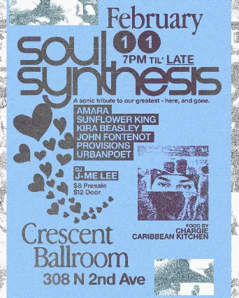 SOUL SYNTHESIS by DJ J-ME LEEwithAmaraSunflower KingKira BeasleyJohn Fontenot ProvisionsUrban Poet Rangelo, roberta flack, roy ayers, J Dilla, Angie Stone & more!Wednesday, February 11th 2026 7:00pm - late21+Advance General Admission Ticket: $7 + feesDay of Show GA Ticket: $10 + fees