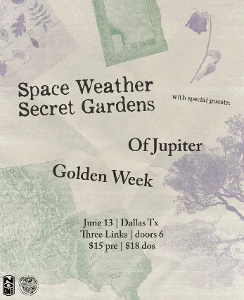 Secret Gardens & Space Weather is coming to Three Links Deep Ellum with special guests: Of Jupiter and Golden Week!This is an ALL AGES event.Please arrive with a physical form of government ID.GA standing room only.