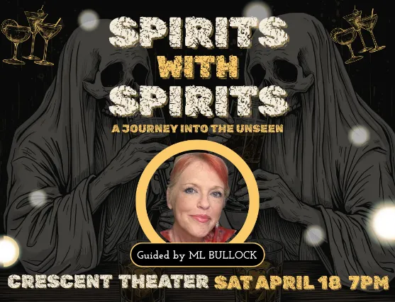 **Limited Tickets Available**Step into the historic Crescent Theater for a soul-stirring evening with prolific author and trusted psychic knower, M. L. Bullock. Known for her deep connection to the spirit world, M. L. acts as a bridge to the other side, bringing forward messages of comfort, clarity, and healing. Whether you are seeking a word from a loved one or a moment of peace, this gallery reading offers a unique opportunity to witness the power of the unseen. What happens when an author meets a ghost? For M. L. Bullock, it results in a best-selling career and a lifelong connection to the spirit world. After a life-changing encounter with the ghosts of Oakleigh inspired her hit Seven Sisters series, M. L. has become a staple of Gulf Coast supernatural lore.Today, she continues to document her findings in the Gulf Coast Paranormal series, fueled by the spirits she encounters across the region. At her Spirits With Spirits events, M. L. steps out from behind the keyboard to act as a bridge, delivering messages of healing and validation from the other side. Join her at the Crescent Theater for an evening where literature and the afterlife collide.
