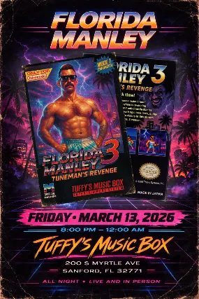 Tuffys Music Box Presents:St. Paddys Party with Florida ManleyTuffys Music Box & Lounge in Sanford, FLFriday, March 13th, 2026 DOORS & SHOWTIME 🚪: 8 PMAGES: 21+ Address: 200 Myrtle Ave, Sanford, FL 32771www.TuffysMusicBox.com**We are committed to making our venue accessible to all patrons. Our facility meets all Americans with Disabilities Act (ADA) requirements, including accessible entrances and restrooms. Reserved tables are an upgrade subject to availability. If you have specific accessibility needs or requests, please dont hesitate to contact us in advance of your visit, or alert one of our staff members, and we will do our best to accommodate you.**