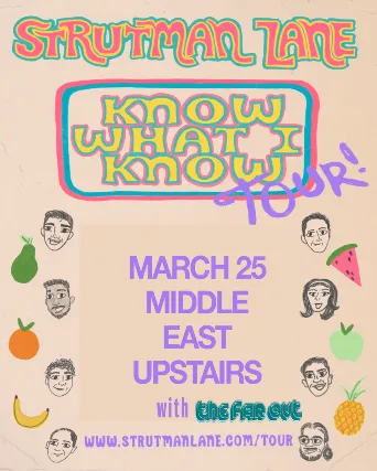 18+ w/Valid I.D. NO I.D.=NO ADMISSION The Middle East presents: -Strutman Lane, The Far Out - 18+, $18 Advance / $22 Day of Show, 7:00 PM Doors NO VAPING OR SMOKING IN THE BUILDING*** DINE and SKIP the Line ***