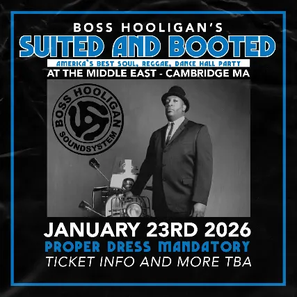 All Ages -- Valid I.D. Required To Drink The Middle East presents: Suited and Booted feat Boss Hooligan - All Ages, $10 , 8:00 PM DoorsNO VAPING OR SMOKING IN THE BUILDING