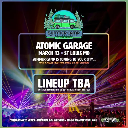 Summer Camp: On The Road TourMar 13, 2026 8:00 PMAtomic GarageAge 21+Summer Camp Music Festival is coming to ST.LOUIS Every vote counts and the top vote-getter wins! Come out and support your favorite area artists as they compete for a spot on the 25th Anniversary Summer Camp lineup and youll be automatically entered in to win a 3-Day GA Pass to the festival just by attending!