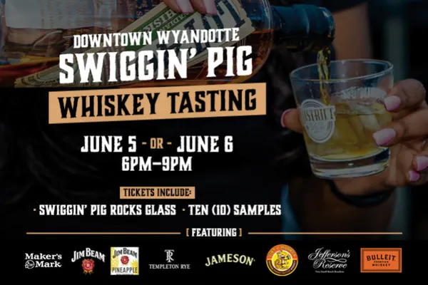 June 5 & 6, 2026๐ 6PM 9PMWhiskey lovers this ones for you.As part of the Swiggin Pig Festival, join us in Downtown Wyandotte for a special Whiskey Tasting Experiencefeaturing a wide selection of premium whiskeys and specialty cocktails.Your tasting ticket includes a Swiggin Pig rocks glass and ten (10) whiskey samples, allowing you to explore a variety of flavors from smooth and smoky to bold and unique.๐ Ticket Pricing:$25 Early Bird Special - ends April 19 at 11:59pm $30 Advance Tickets$35 Day of Event๐ฅ Featured Brands Include:Jim Beam PineappleMakers MarkTempleton RyeTempleton WhiskeyJeffersonsJamesonDirty Monkey Banana Peanut Butter WhiskeyAmerican Born Apple Pie Whiskeyand more to be announced!Each tasting station will feature either a straight whiskey sample or a crafted cocktail, giving you the chance to try something new and discover your next favorite pour.๐ Event Details: Choose Friday, June 5 or Saturday, June 6 Tasting runs 6PM9PM Ticket valid for one night of samplingโ ๏ธ Must be 21+ with valid ID to participate.Enjoy great whiskey, live music, BBQ, craft beer, and the energy of the Swiggin Pig Festival in beautiful Downtown Wyandotte.Grab your friends and come raise a glass with us! ๐ฅ