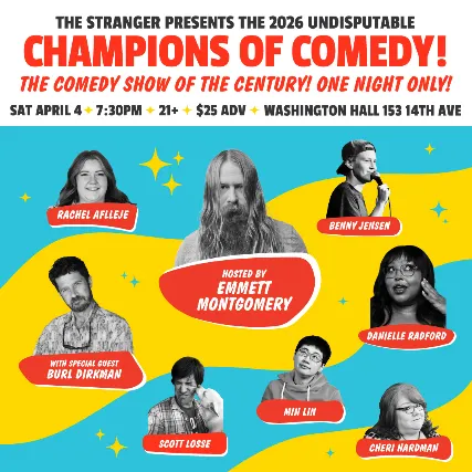 The Stranger Presents the 2026 Undisputable Champions of ComedyHosted by Emmett MontgomeryFeaturing Seattles best comedians, including:Cheri HardmanScott LosseDanielle RadfordRachel AfllejeBenny JensenMin LinWith Special Guest Burl DirkmanA showcase of some of the best stand up comedians and emerging voices that make Seattles comedy scene brilliant and beautiful, and who tell jokes in ways only they can. In this one-of-a-kind show youll see Seattles funniest people (and hilarious up-and-comers) all on one stage, serving as Seattles 2026 undisputable Champions!