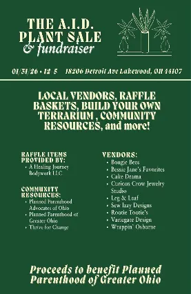 Multiple vendors selling handmade items ranging from shirts, jewelry, pots and plants!Raffle Baskets donated by community members and local businesses.Tickets are $1 for 1 and $25 for 20.All money from the raffle baskets and donated plant items will be donated to Planned Parenthood of Greater Cleveland.