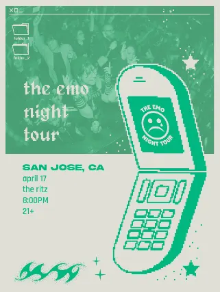 The Emo Night Tour is coming to San Jose on April 17th!*21+.....doors/show start time 8:00pm*The greatest tribute night to the music that was never just a phase (including this event, which has been raging all across the country since 2015 and is only getting BIGGER AND BETTER)!The Emo Night Tour Band will play some of the biggest emo songs in existence with the ENT DJs spinning all the angst your teenage dirtbag heart desires all night long that will make you feel like youre at Warped Tour 08 minus all the dust and melting in the sun!So just imagine going to a show and hearing Taking Back Sunday, Fall Out Boy, Panic! At The Disco, My Chemical Romance and many more, all only playing their best songs...all night long in a dance club atmosphere.These shows will be selling out and fast, so make sure to Tell All Your Friends and Sugar, Come Down!
