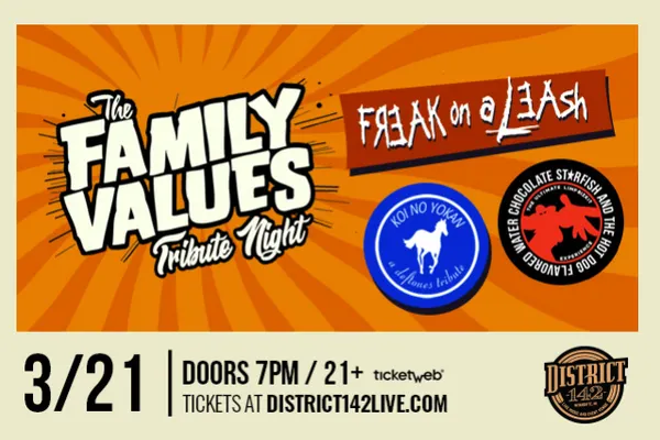 This event is 21 and over. Any ticket holder unable to present valid identification indicating that they are at least 21 years of age will not be admitted to this event, and will not be eligible for a refund. NO REFUNDS OR EXCHANGES. This ticket is a revocable license which may be withdrawn and admission refused anytime upon refunding the printed purchase price. The holder of this ticket is admitted on condition and by using this ticket agrees (s)he will not make or transmit or aid in transmitting and description, account, picture or reproduction of the event to which this ticket admits him. This ticket may not be used for advertising, promotion (including contests and sweepstakes) or other trade purposes without the express written consent of District 142. Breach of the foregoing will automatically terminate this license. Any person whose conduct is deemed by management to be disorderly or who fails to comply with the rules and regulations of event, or the terms and conditions herein, may be refused admission or ejected. Holder grants permission to the Performers and their agents to utilize the holder's image or likeness incidental to any live or recorded video display or other transmission or reproduction, in whole or in part, of the event. Professional cameras, tablets, audio recorders and video recorders are not permitted in District 142 without special permissions / credentials from District 142 in advance of the show. HOLDER VOLUNTARILY ASSUMES ALL RISK AND DANGER of personal injury and all other hazards arising from or related in any way to the event for which this ticket is issued, whether occurring prior to, during or after the event, and further agrees that District 142 LLC and 142 Live LLC ARE NOT RESPONSIBLE OR LIABLE FOR ANY INJURIES, EXPENSES, CLAIMS OR LIABILITIES RESULTING FROM OR RELATED TO SUCH CAUSES. NO ALCOHOL, DRUGS, WEAPONS, FOOD, CANS OR GLASS CONTAINERS ALLOWED. Bags, purses & clutches larger than 5" x 8" x 2" ARE PROHIBITED. Single compartment bags, wallets & clutches smaller than 5" x 8" x 2" WITH OR WITHOUT A HANDLE OR STRAP ARE PERMITTED. An exception will be made for medically necessary items after proper inspection. Aerosol cans (hairspray, mace, pepper spray, etc.), marijuana or illegal narcotics, including accessories or paraphernalia associated with marijuana or illegal narcotics use, animals (except approved service animals or service animals in training), Noise Making devices: air horns, fog horns, bullhorns, thunder sticks, cowbells, bells, horns, kazoos, whistles, vuvuzelas, didgeridoos and other noisemakers, coolers, Smoking of any kind (cigarettes, e-cigarettes, vaping, etc.), fireworks or any types of explosives, laser pointers, any device that could create an optical illusion, or any similar devices,Professional &/or commercial cameras with interchangeable or detachable lenses,video and/or sound recording devices including laptops, tablets, iPads and/or Go Pros, Or weapons of any kind (including firearms, pocket knives, pepper spray, mace) toy or fake weapons (including squirt guns or super soakers) are prohibited. We do not release set times. Our events have a "no re-entry" policy, which means once you enter, you cannot leave and re-enter. Almost all of our shows are general admission standing room only, which means that there is no assigned seating. For most shows, the mezzanine offers seating, which is also first come, first serve. The ticketing site will list all options available for each show. Ticket options are subject to changes and adjustments as determined by the venue and at their sole discretion. The venue reserves the right to move, adjust or eliminate ticket options at any time without notice.