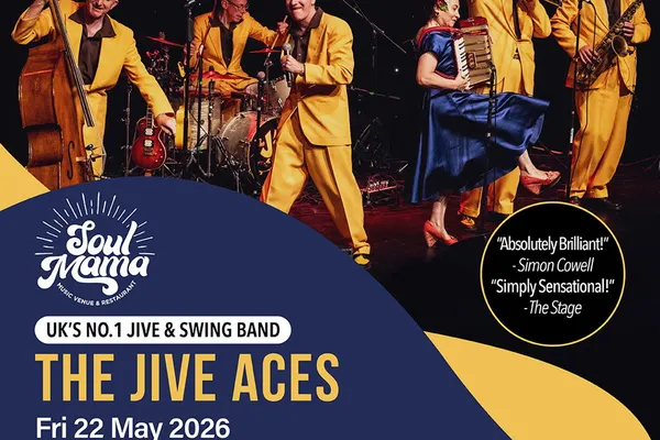 Renowned worldwide for their high-energy spectacular showmanship, their viral video Bring Me Sunshine and for being the first live band to reach the final rounds of Britain's Got Talent, The Jive Aces have firmly established themselves the UKs No.1 Jive & Swing band.The in-demand sextet average 300 shows a year and have worked with Van Morrison, Keely Smith and performed for Her Majesty the Queen. They headlined and sold-out the Royal Albert Hall and thousands of festivals, theatres, dance halls, etc, in 35 countries, including Buckingham Palace for the Coronation Festival, Trafalgar Square for the Olympics and major theatre tours in the USA.The new albums "Diggin' The Roots Vol.1 Rockin' Rhythm & Blues" and "Vol.2: Hot Jazz" are a journey into the two branches of music that makes up the Jive Aces signature sound, proving that vintage music is very much timelessly classic.Their performance at the 2015 Glastonbury Festival was listed by the Daily Telegraph as one of the festivals highlights.The Jive Aces wowed the judges on Britains Got Talent with their show-stopping version of Wanna Be Like You, which famously cheered up a grumpy Simon Cowell. Their BGT appearances have been seen by over 20 million.