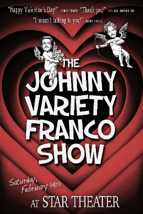 THE JOHNNY VARIETY FRANCO SHOWThe Brazilian self-claimed professional entertainer, his real brother plus great cast of local performers invite you to spend Valentines Day at Star Theater this year. Music, drama, comedy, surrealism and romance awaits you in this ambitious production by Portlands favorite pair of hair and noses: The Franco Brothers.