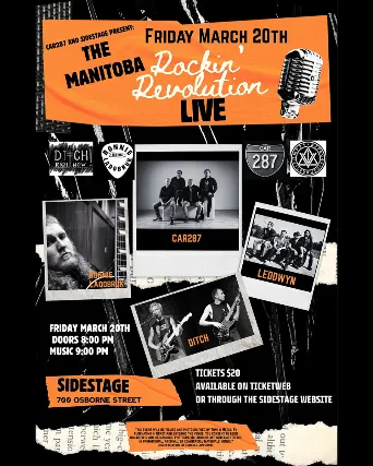 Friday, March 20, 2026The Manitoba Rockin Revolution:Car 287LeddwynRonnie LadobrukDITCH!Doors 8PMMusic 8PM$20 Advance or from the band directlyALL AGES