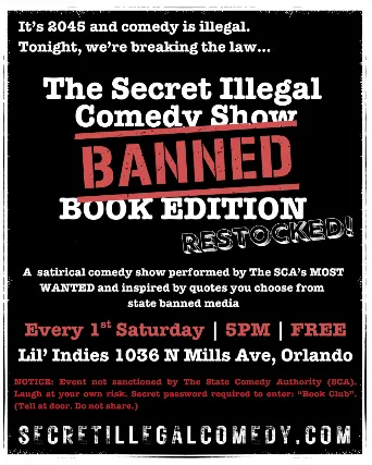 The Secret Illegal Comedy ShowA free Improv Comedy show every First Saturday of the month from March 7th to June 6thLil Indies5pm to 6:30pmFree/Pay what you can21 and upIts 2045 and comedy is illegal so were breaking the law A satirical comedy show set in a not so distant dystopian future where comedy is illegal and those who love to laugh meet in secret. Inspired by state suppressed media, news headlines, and your shout outs. The Secret Illegal Comedy Show is a fast, funny, and fully improvised satire where todays events are historyand youre part of the resistance. Set in a future where comedy is outlawed, our underground performers will look back on events of 2026 as if theyve been living with the consequences for 20 years. In a world where laughter is a crime, we dare to keep it alivetogether. Featuring The State Comedy Authoritys Most Wanted: Roo Nafasat, Aimee LeCours, Chris Trovador, Jason Montilla, Greg Tinsdale, Eddie Geller, and Anthony Francis. NOTICE: This event is not sanctioned by The SCA. Laugh at your own risk.