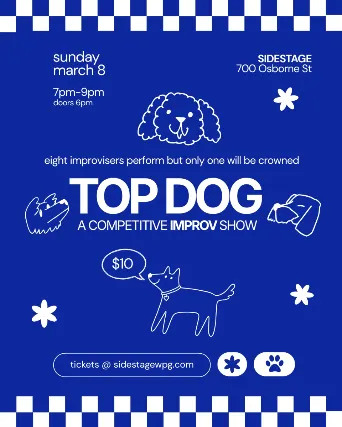 Saturday, March 8, 2026International Womens DayTOP DOG - A Competative Improv ShowEight improvisors perform, but only one is crowned!Doors 6PMShow 7PM-9PM$10 Advance | $15 DoorsALL AGES*Limited Capacity