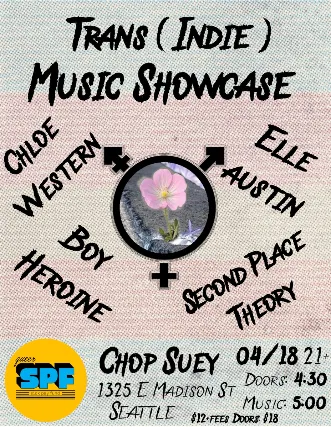 Trans (Indie) Music ShowcaseFeaturing Second Place Theory, Boy Heroine, Elle Austin, Chloe Westernwith a portion of proceeds going to The Queer Sick Pay Fundon Saturday, April 18th