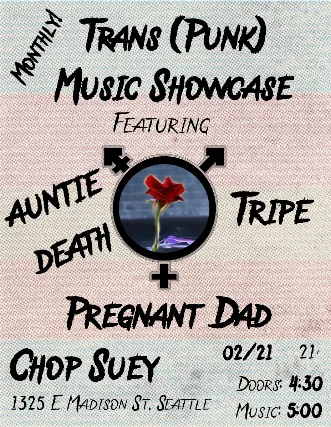 Trans (Punk) Showcase:Featuring Pregnant Dad, Auntie Death and Tripeon Saturday, February 21st at Chop Suey20% of proceeds go to Gender Justice League